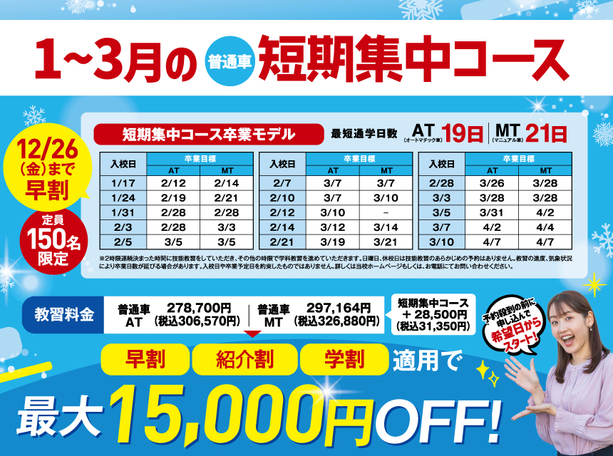 1~3月の普通自動車の短期集中コース受付がスタート!