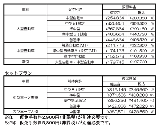 教習料金改定のお知らせ(大型自動車・中型自動車・けん引) 2026/02/19 令和8年4月1日以降の入校分より、下記車種の教習料金を値上げすることとなりました。教習生の皆様には変わらず、安心快適な教習を提供できるよう努めてまいります。なにとぞご理解賜りますようお願いいたします。